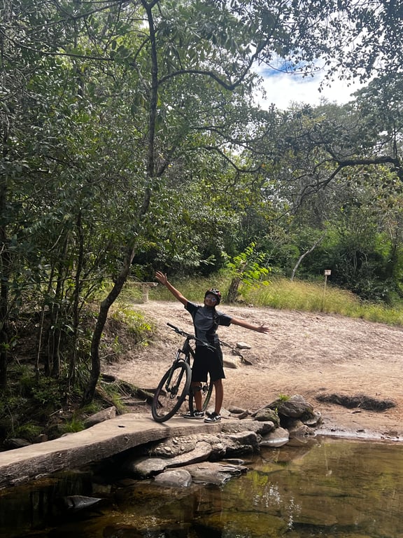 Pedal incrível pelo Parque Nacional da Serra do Cipó! Saída da Portaria do Parque, seguimos de bike por 06km e mais 02km de caminhada até nosso destino, trilha leve com poucos desníveis. Ao final da trilha, somos presenteados com a Cachoeira da Farofa - uma queda d’água exuberante, com cerca de 70 metros de altura, que despenca por uma parede de quartzito formando um poço ideal para um banho refrescante.