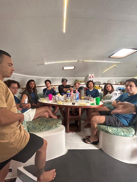 A expedição acontece a bordo do Catamarã Zeus, um veleiro live aboard, que funciona como base flutuante durante os dias de imersão. A partir dele, realizamos remadas em canoas havaianas entre ilhas, recifes e áreas de águas cristalinas, sempre respeitando as normas ambientais do parque, além de momentos para mergulhos com snorkel para observação da vida marinha.