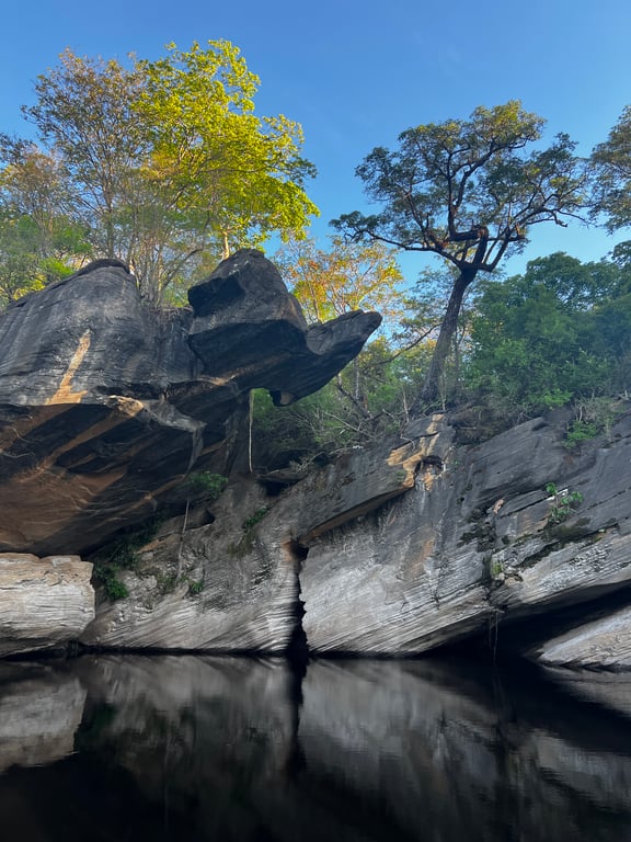 No local existe uma lapa na beira do rio, que deixa a paisagem ainda mais
