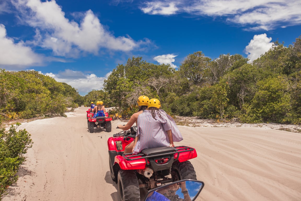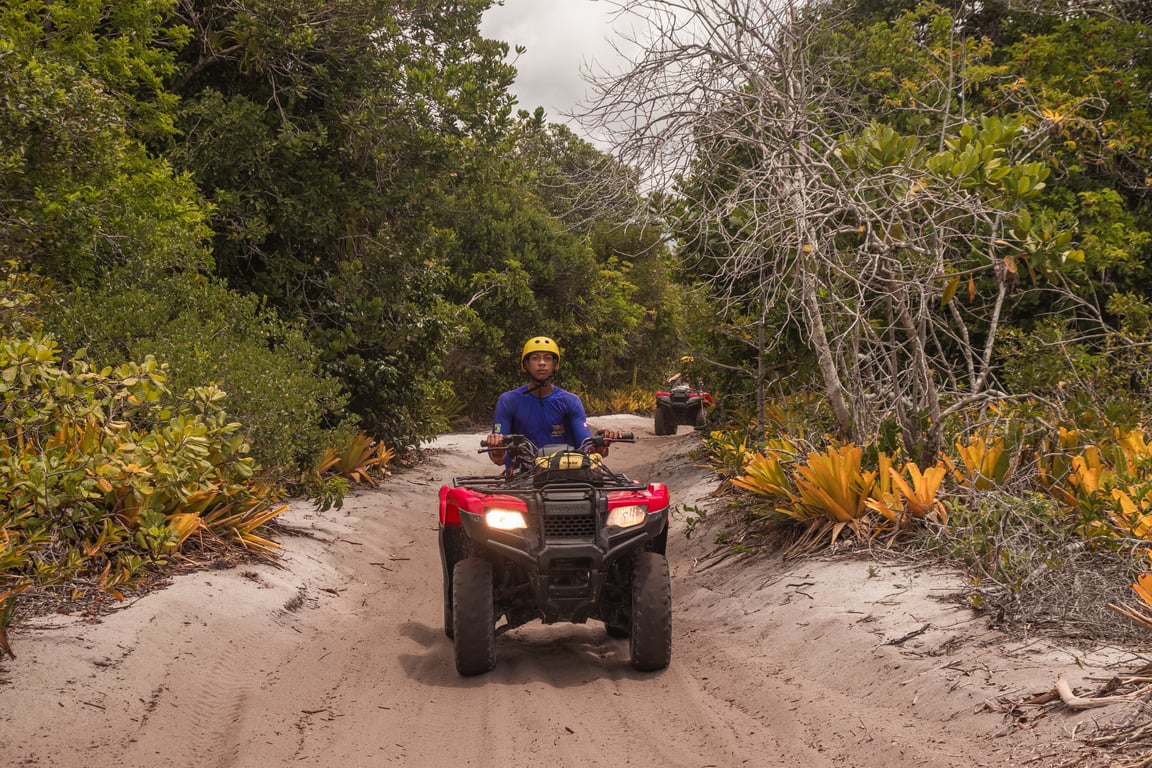 Viva uma das experiências mais marcantes do sul da Bahia: o trajeto de quadriciclo que liga Trancoso à charmosa Caraíva. O caminho combina aventura e cenários deslumbrantes. Ao chegar em Caraíva, você é recebido pelo encontro do rio com o mar e pelo charme único das ruas de areia.Você poderá desfrutar de um tempo neste lugar paradisíaco, tomar um banho de mar e de sol, almoçar nas barracas e se divertir.